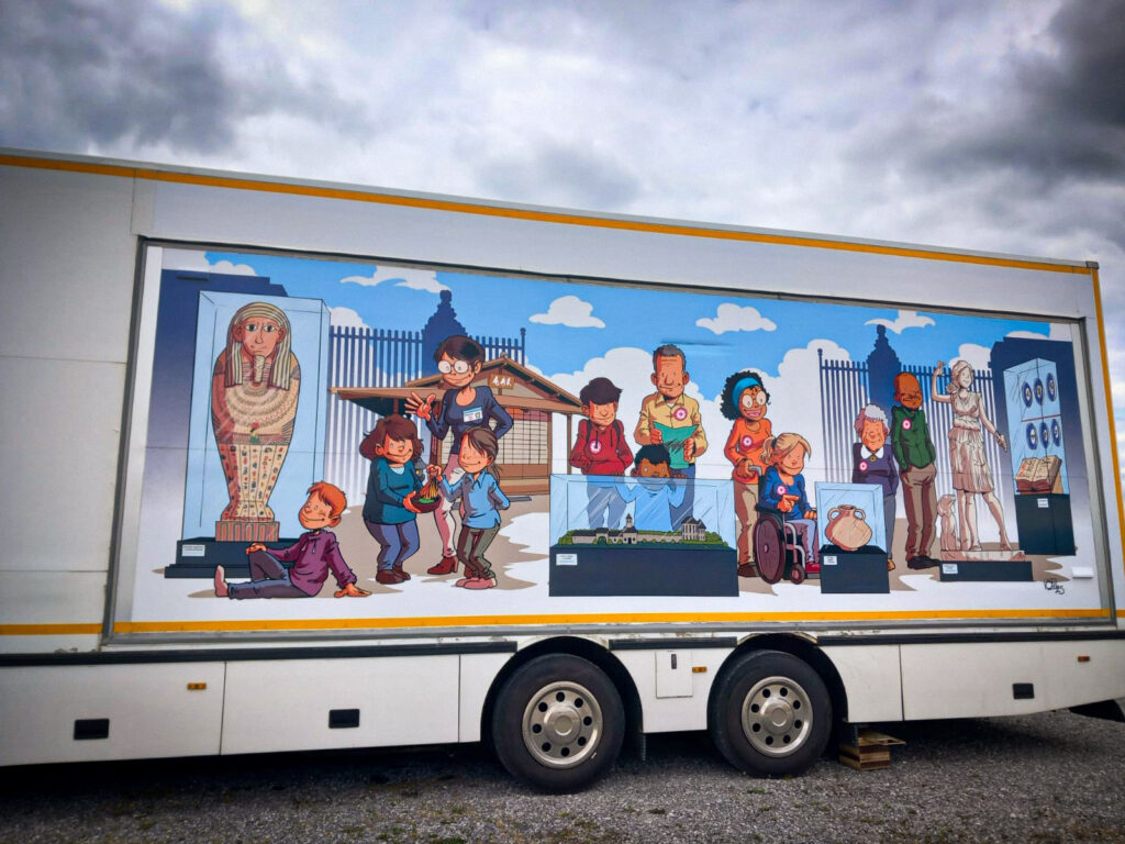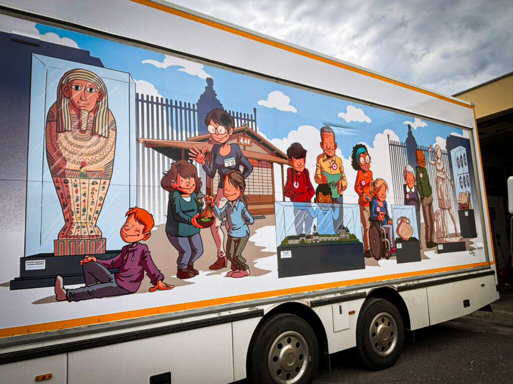 Au début de l’été 2025, j’ai eu la chance de pouvoir redécorer le Muséobus, le musée roulant du Musée royal de Mariemont !